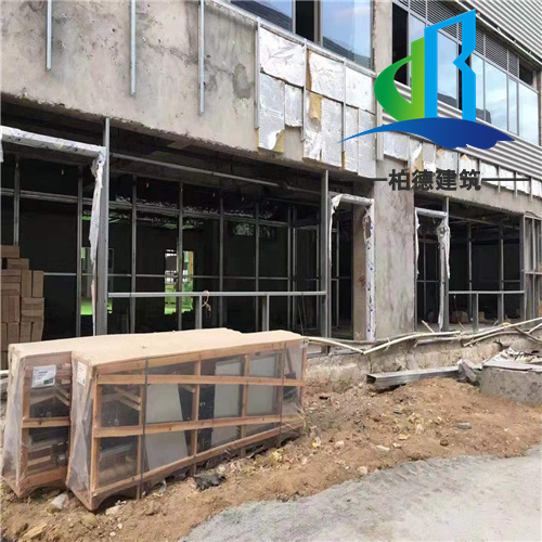 泄爆墙安装流程:泄爆墙施工顺序为:轴线定位→地龙骨→天龙骨→竖龙骨→横龙骨→内侧防火板→岩棉→外侧防火板。防火板室外侧墙涂刷外墙防水涂料,涂刷涂料前先填板缝→墙面先刮两道水泥基弹性防水腻子→再刷防水涂料。天地龙骨与混凝土地面或楼板采用M8膨胀螺栓连接,螺栓间距800MM。天龙骨与钢结构采用M6自钻螺钉连接,螺钉间距600MM。