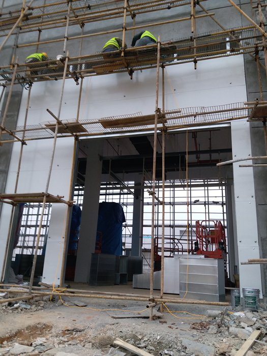 (4)安装墙体内防火.隔音.防潮填充材料,与另一侧泄压板同时进行安装填入。
